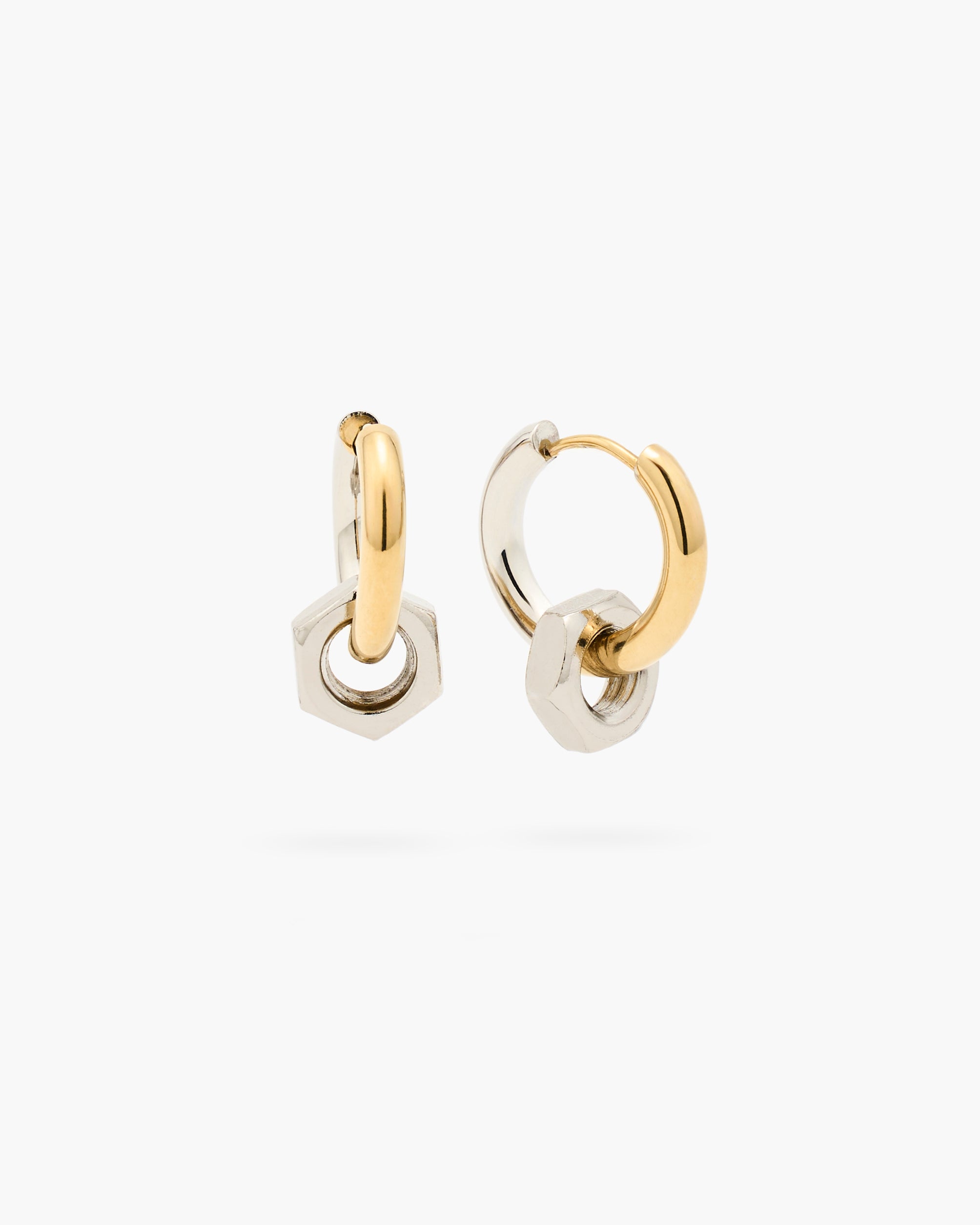 Boucle d'oreille bicolore ornée d'un écrou. Ce dernier est sublimé par un bain de palladium. Vendue à l'unité ou en paire.