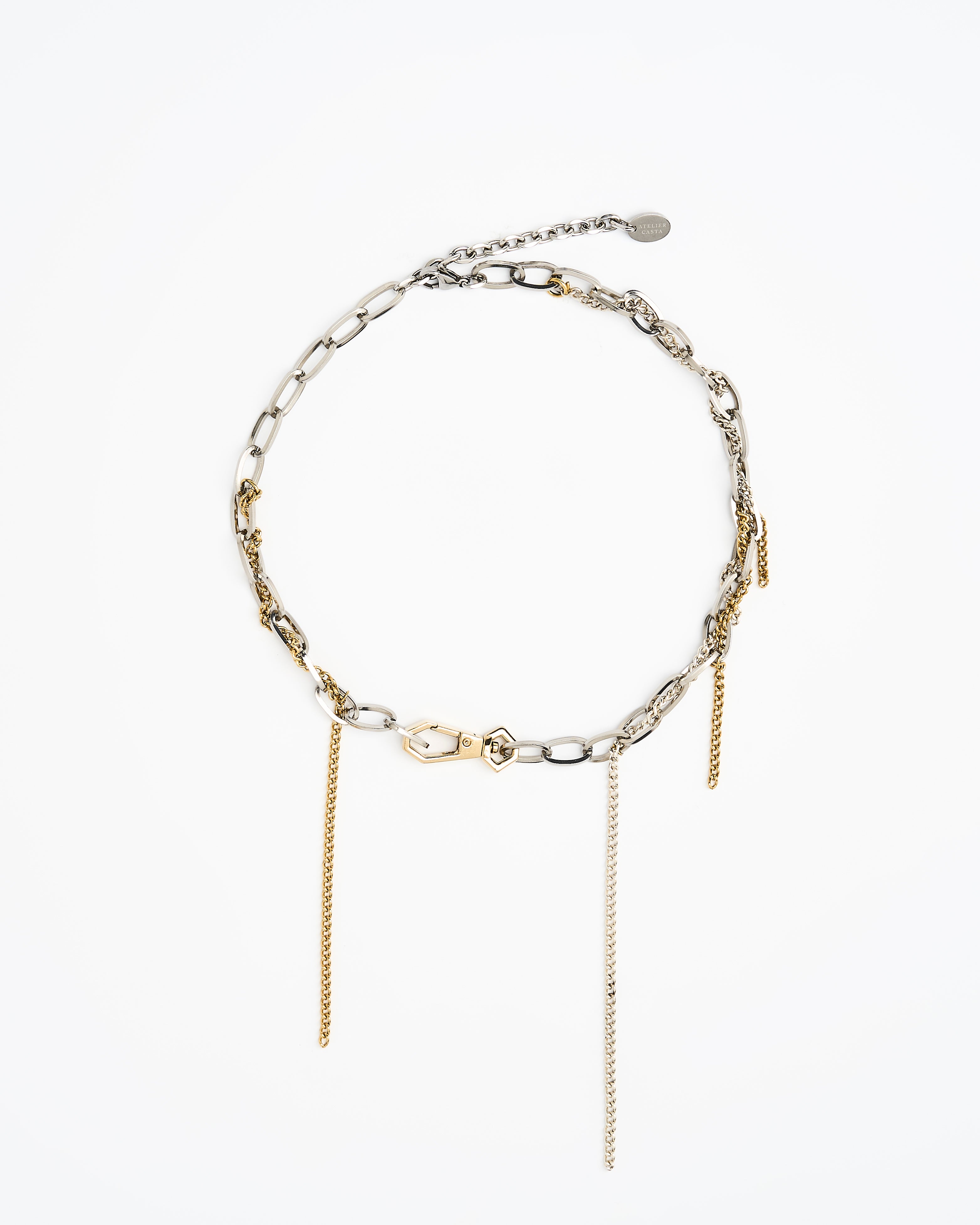 Collier asymétrique upcyclé à partir de chaînes vintage et de seconde main. Un mélange détonnant de couleur or et argent pour un look résolument tendance.