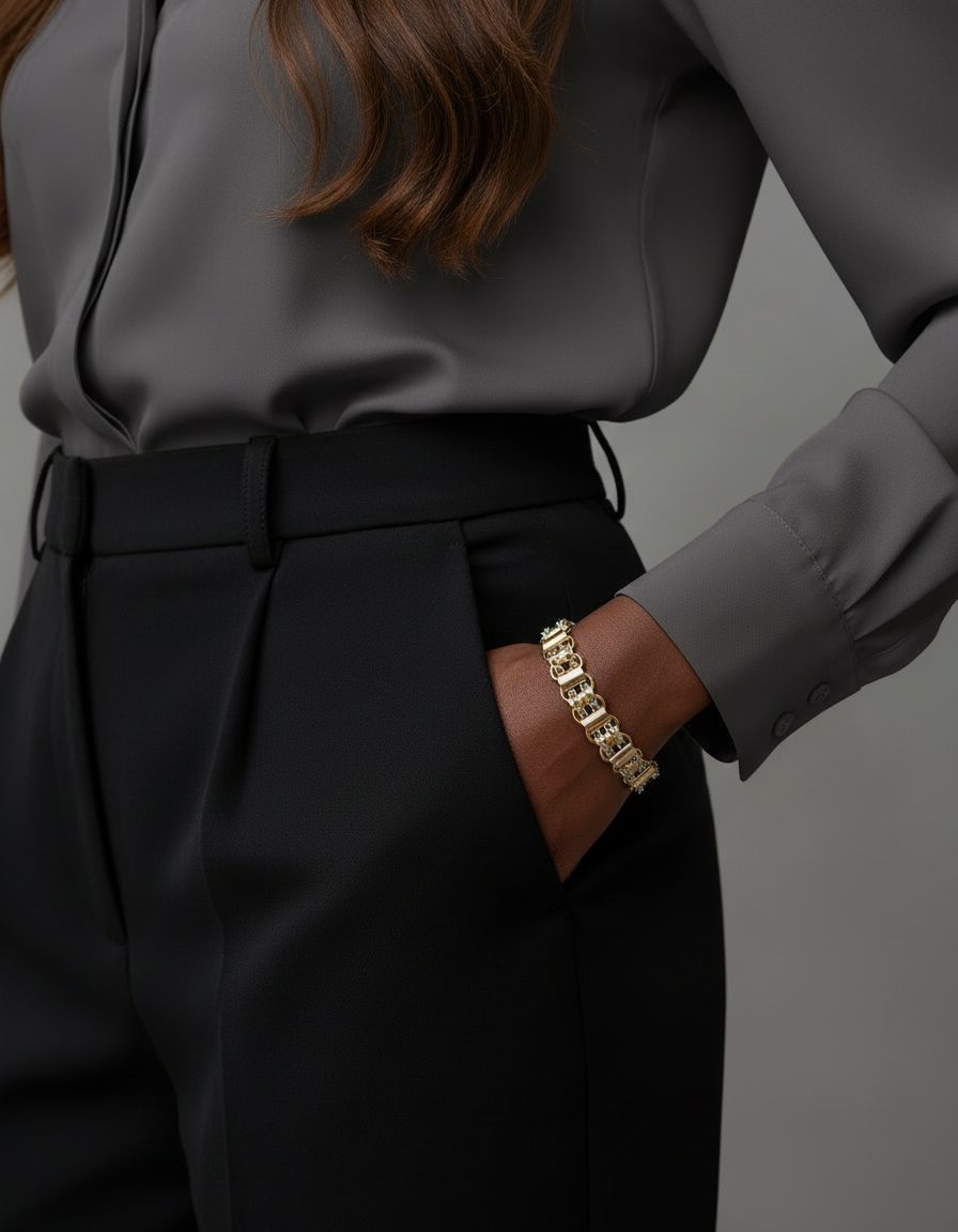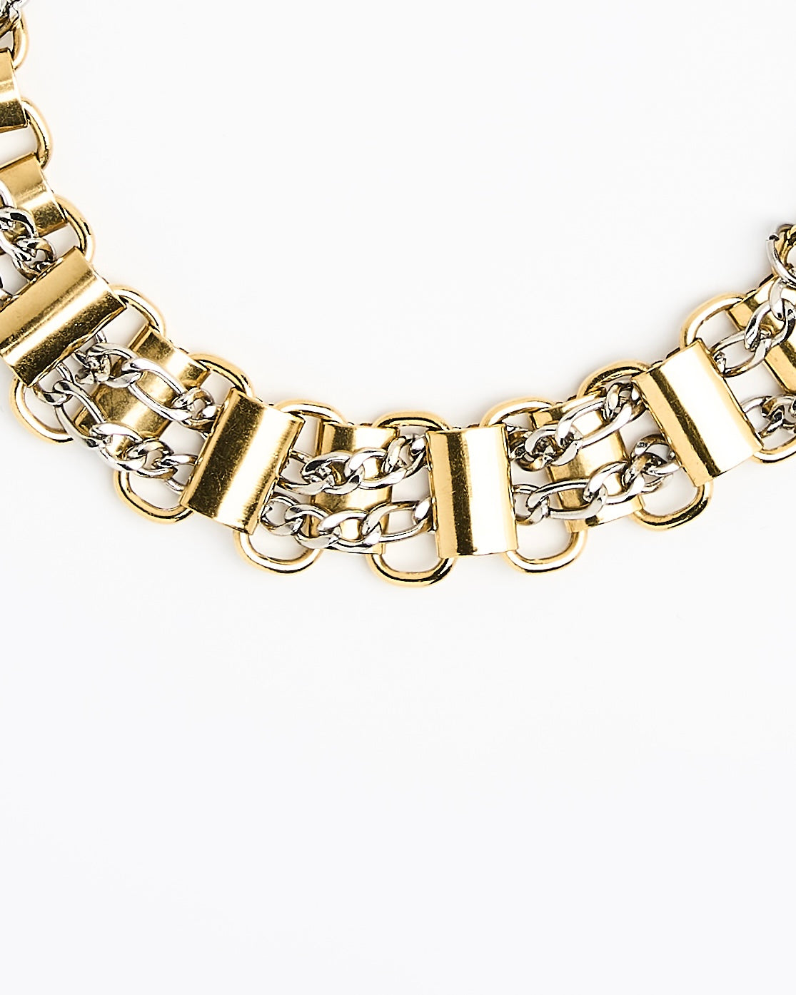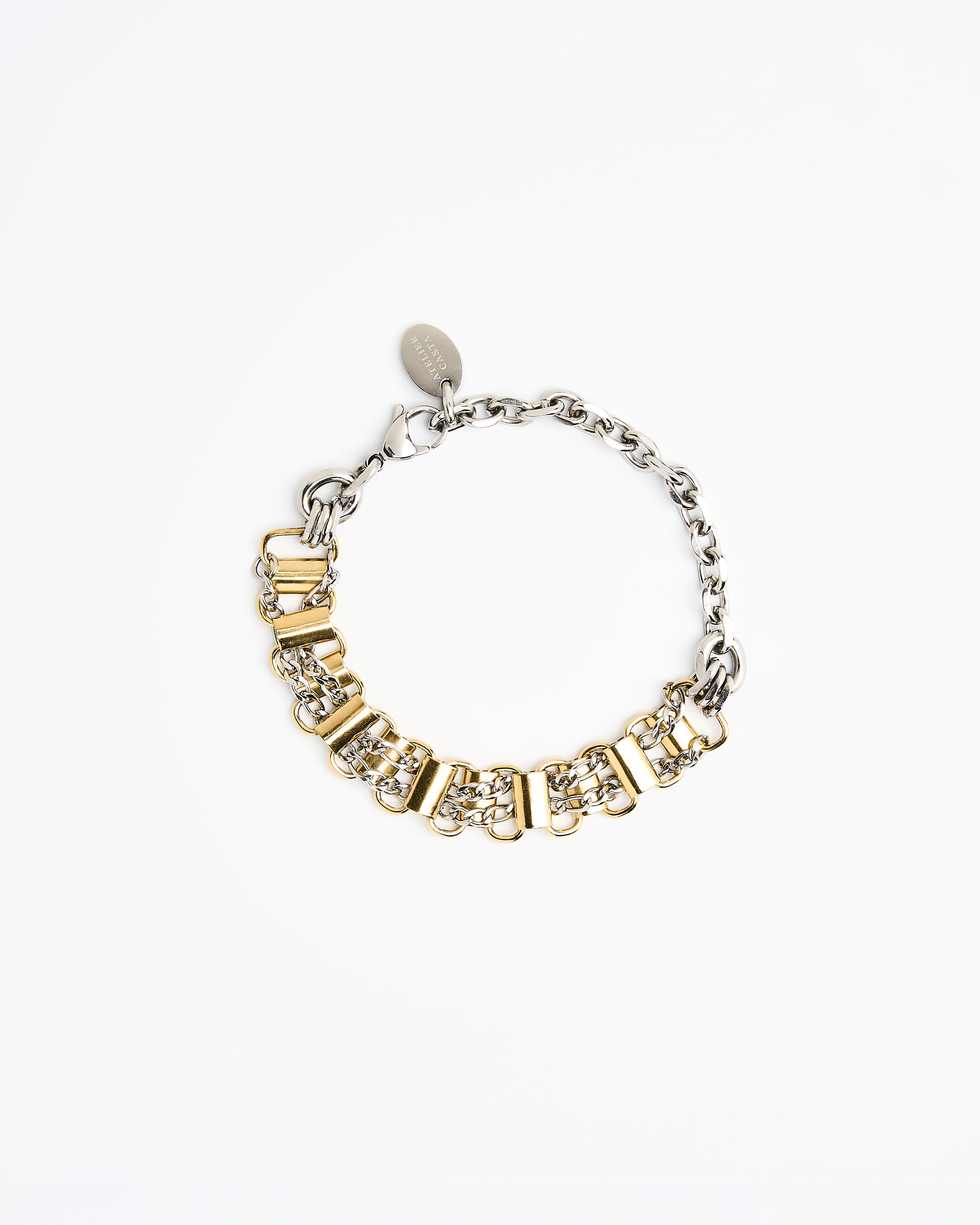 Bracelet upcyclé en laiton trempé dans un bain d’or pâle tressé d’une chaîne gourmette en acier inoxydable.