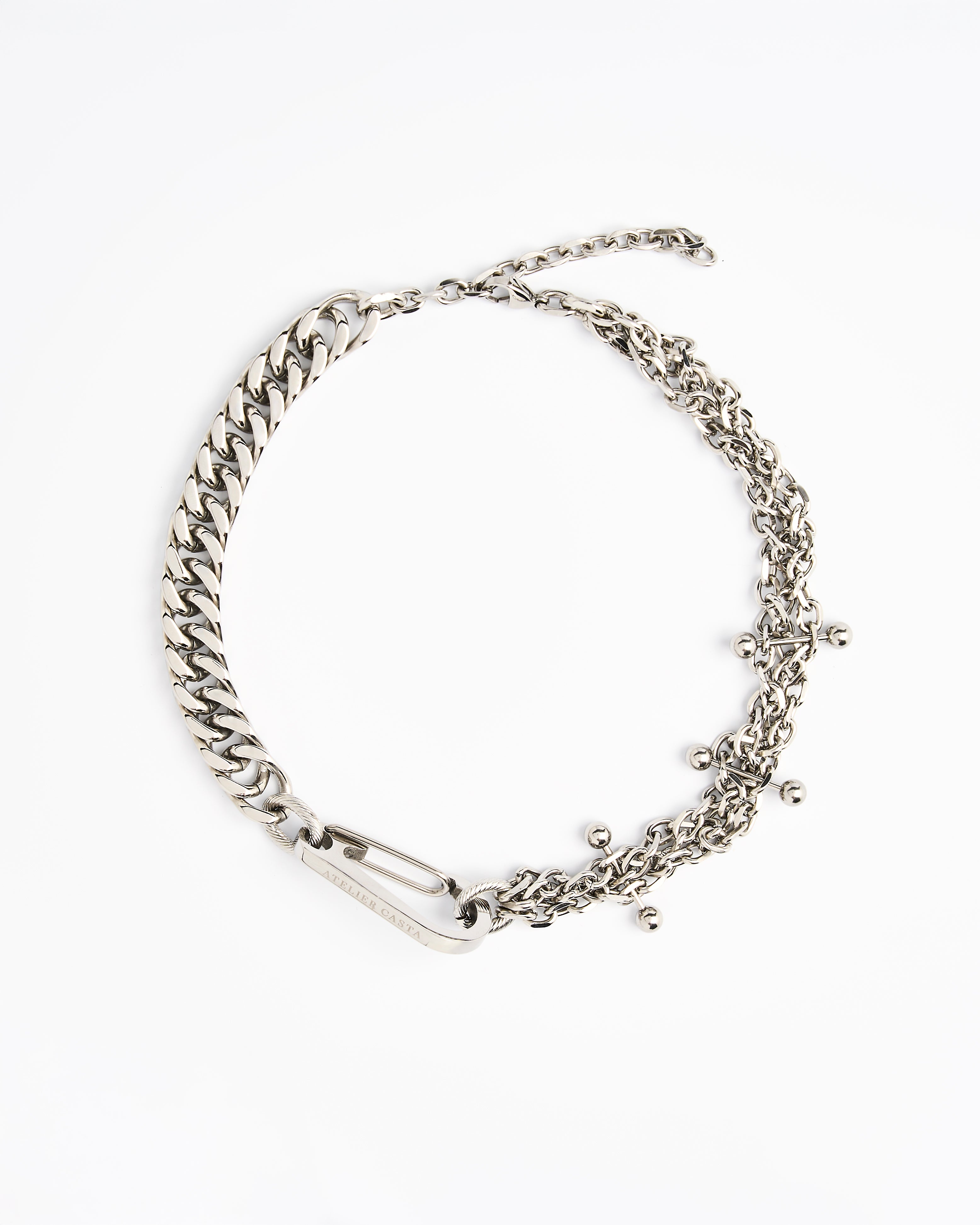 Collier en chaîne cubaine et câble en acier inoxydable argentée, ornée de piercing à tétons en acier inoxydable. Mousqueton XXL gravé au nom de la maison en acier inoxydable argenté.