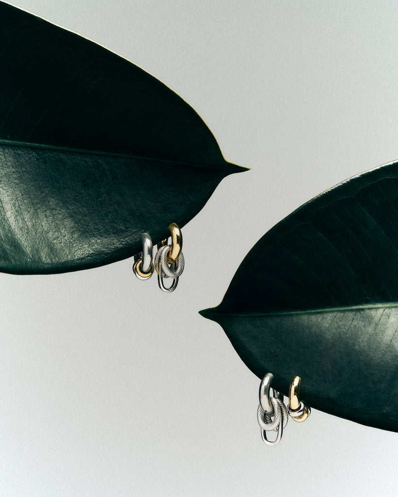 Mono boucle upcyclée à partir de maillons trempés dans un bain de palladium et d'un mousqueton homard trempé dans un bain d'or pâle 24K. Vendue à l'unité ou en paire.